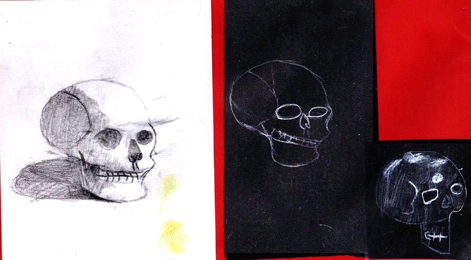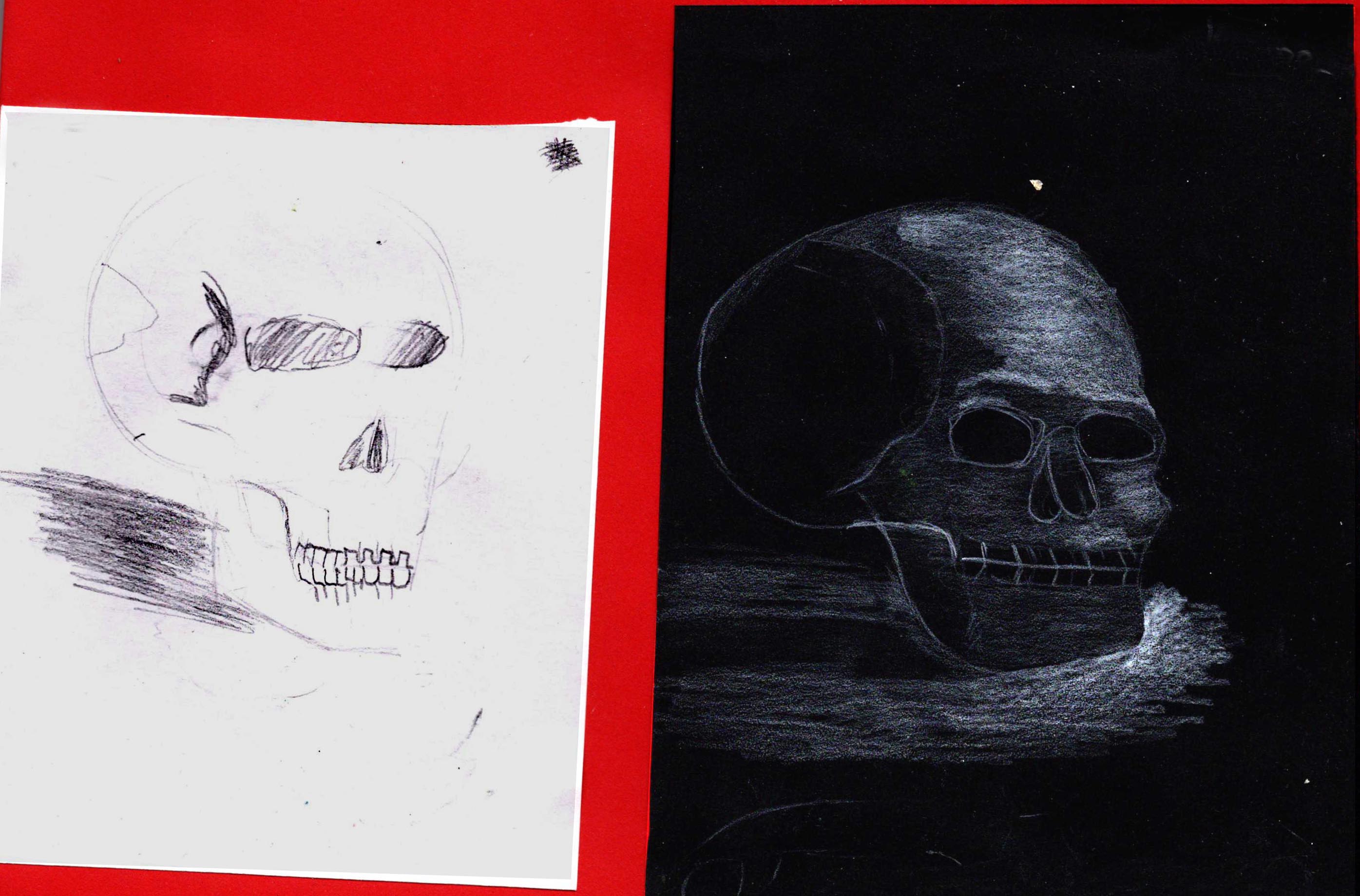 Les enfants ont travaillé d’après la photo d’un crâne, tout d’abord sur du papier blanc avec un crayon noir, puis sur papier noir avec crayon blanc. Quelle gymnastique pour les yeux, le cerveau et la main!