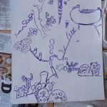 Les crayonnés agrandis ont été transférés, grâce à un tour de magie, sur le format définitif. Les enfants ont ensuite patiemment encré les traits (même ceux qui n’étaient pas les leurs, car ils travaillent pour leur groupe) au stylo-pinceau.