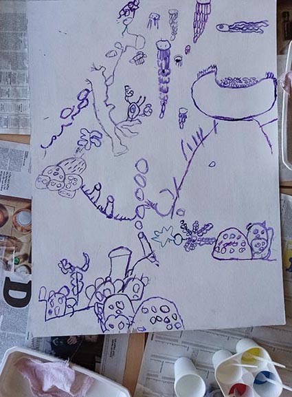 Le sujet est compliqué, mais ça n’est pas une raison pour ne pas s’y frotter ! Les enfants sont très pressés de « finir » leur dessin dès la première séance… Ils ont beaucoup d’idées et veulent vite les coucher sur le papier. Certains sont frustrés par mes contraintes, mais il s oublient vite cet empressement et suivent bien les consignes ensuite: ce qui nous permet de bien avancer.
